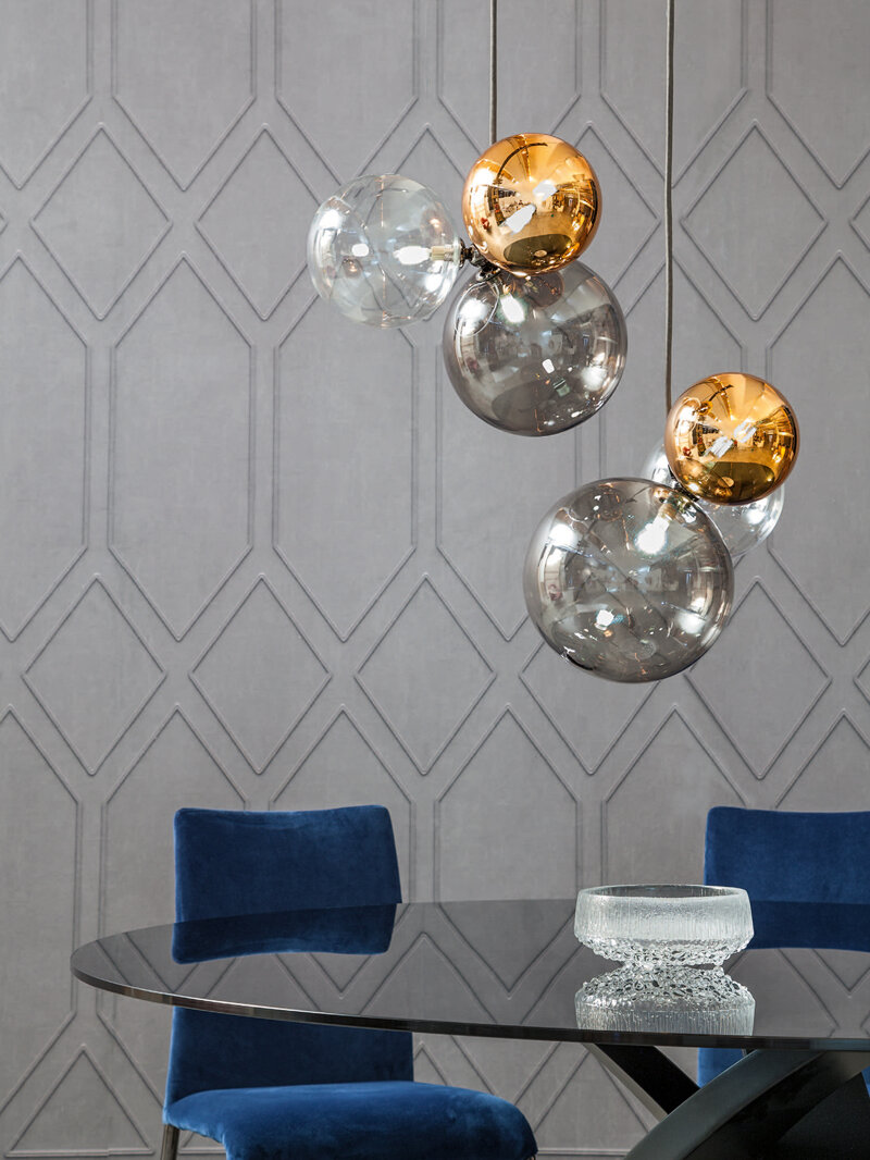 Lampada a sospensione in vetro soffiato con filo tessuto grigio antracite con rosone cromo nero e personalizzabile la configurazione delle 3 sfere in vari colori.