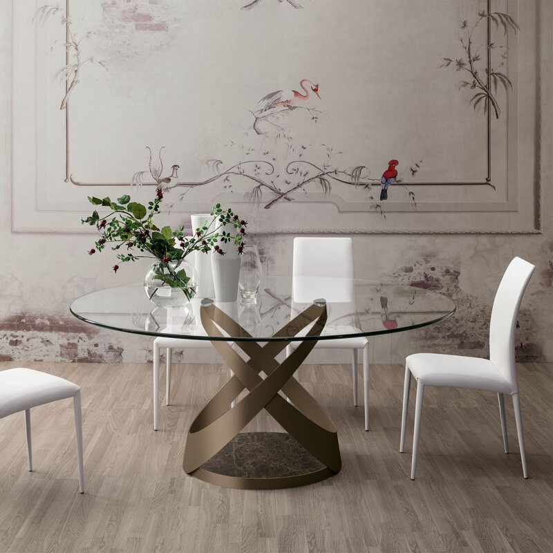 Struttura metallo colore bronzo pietra, marmo emperador e piano tondo diametro 140 cm vetro trasparente
