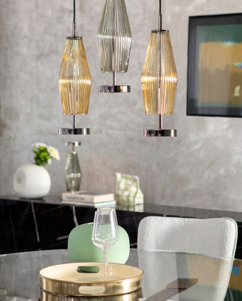 Eleganti lampade di design a sospensione, formate da sagome in cristallo trasparente dalle delicate geometrie e dettagli in finitura cromo nero: la luce riverbera attraverso la superficie cannettata del vetro dalle tonalità ambra e fumè, creando una calda atmosfera. Le lampade Chic sono combinabili in molteplici composizioni e posizionabili a diverse altezze e distanze, per personalizzare ogni spazio living. Chic è disponibile anche in versione da tavolo, con base d’appoggio in metallo verniciato con finitura cromo lucido.