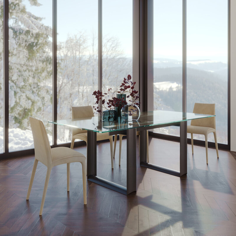 Tavolo Cube dalle linee snelle e poco ingombranti ma con stile. Base metallo bronzo pietra o grigio carbone Binario colore grigio carbone Piano vetro rettangolare 160 x 90 cm trasparente sp 12 mm Prezzo listino 2.977,00 euro