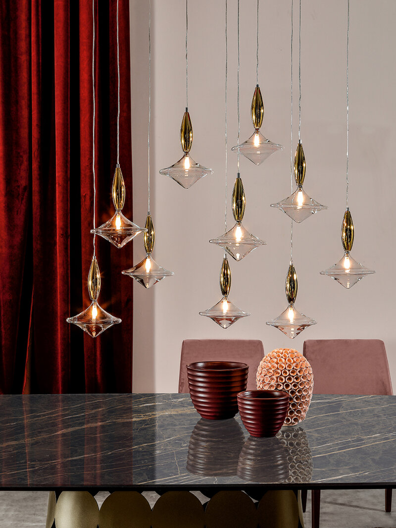 Lampada sospensione a sei luci con parte illuminante in vetro soffiato trasparente e parte superiore colore bronzo o oro con rosone incluso.