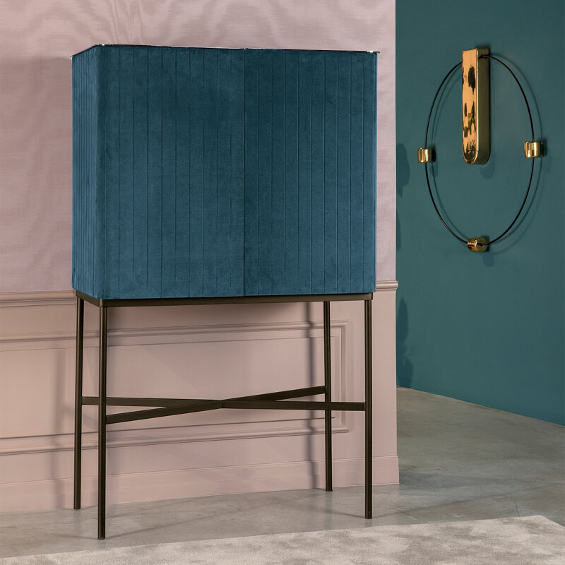 BOX CONTENITORE EXTRO 2 ANTE CON ANTA TESSUTO RIVESTITA IN VELLUTO VEGA OTTANIO E CON SUPERIORE IN GRES PORCELLANATO AGATA NATURALE BORDATO CON FILO CROMO LUCIDO BASE METALLO VERNICIATO BRONZO PIETRA.