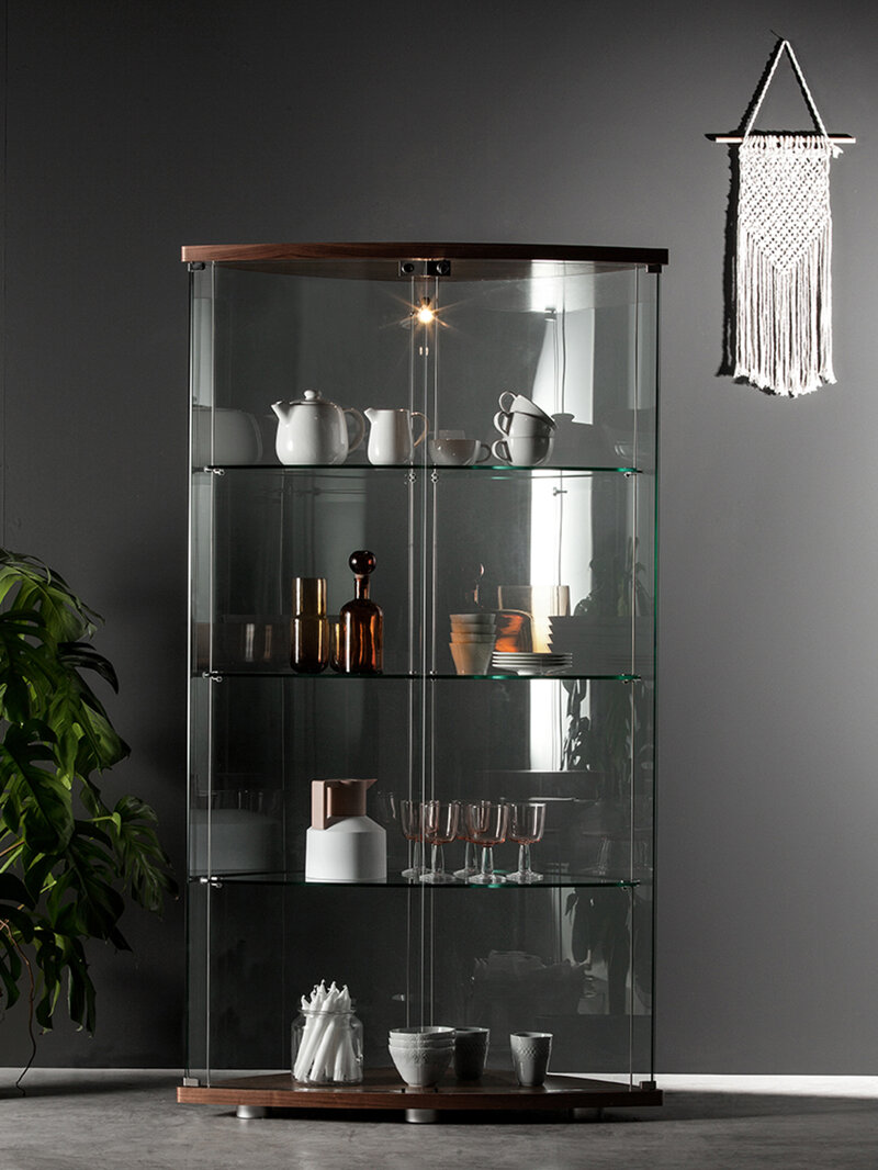 Una vetrina dalle forme morbide e semplici, la cui curvatura è perfetta per evidenziare la preziosità del contenuto. Il legno sorregge e ispessisce base e top, mentre del morbido vetro curvato segue le linee di ante e schienale. Il faretto a LED integrato impreziosisce ulteriormente il tutto.