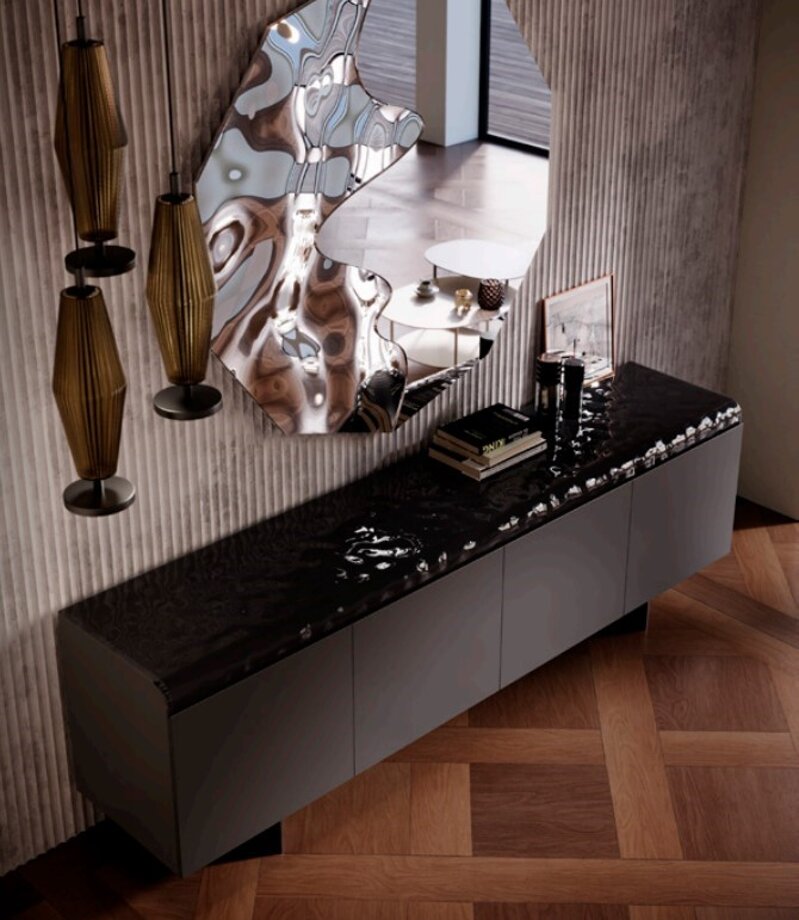 Madia con top in vetro martellato nero e struttura con tre ante laccata bronzo pietra base in metallo finitura bronzo pietra.