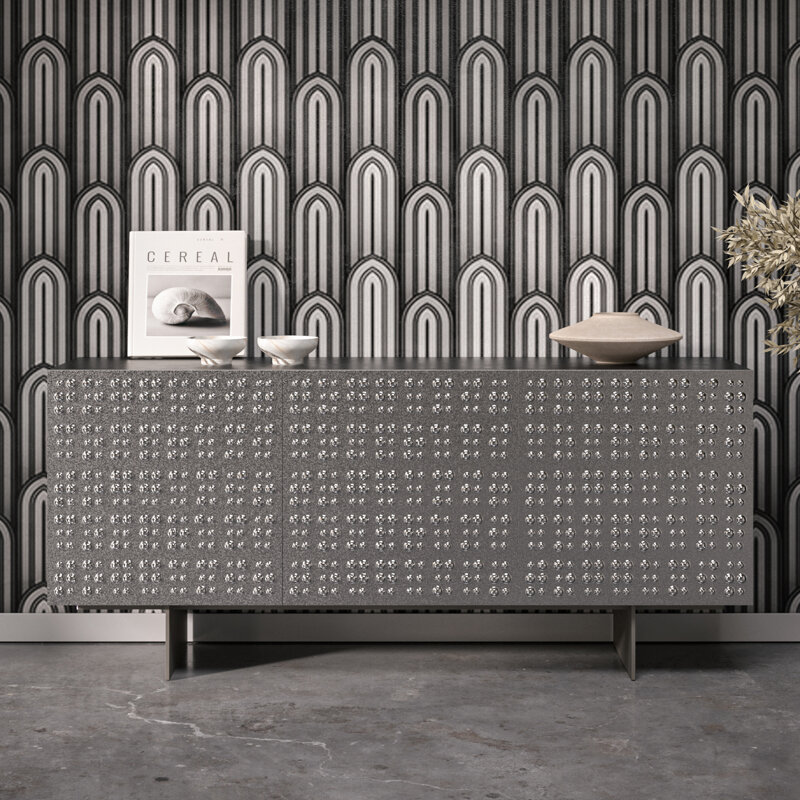 Madia con struttura laccata nero opaco e 3 ante con lavorazione bolle sullo specchio bronzo o fumè. Base in metallo verniciato bronzo pietra o grigio carbone.