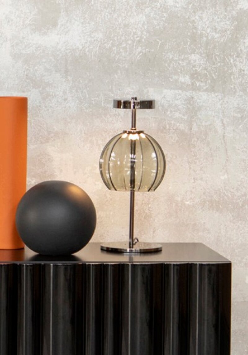 Lampada da Tavolo con struttura in nichel nero lucido e ampolla in vetro soffiato possibile in due versioni di colore e filo in tessuto grigio antracite. Dimensioni diametro 19 cm h 52 cm con relativo interruttore. Prezzo listino con iva euro 1.181,00