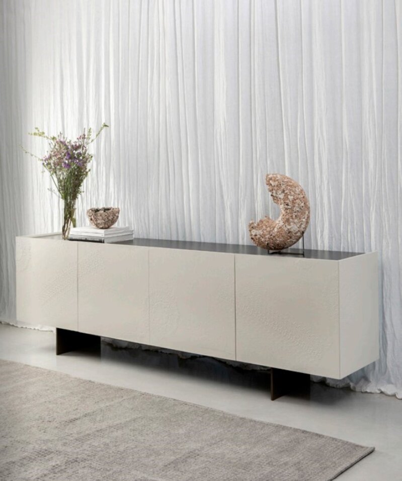 Madia a 4 ante con superfici materiche in argilla modellate a mano con trama pizzo. Fianchi rifiniti come le ante.
