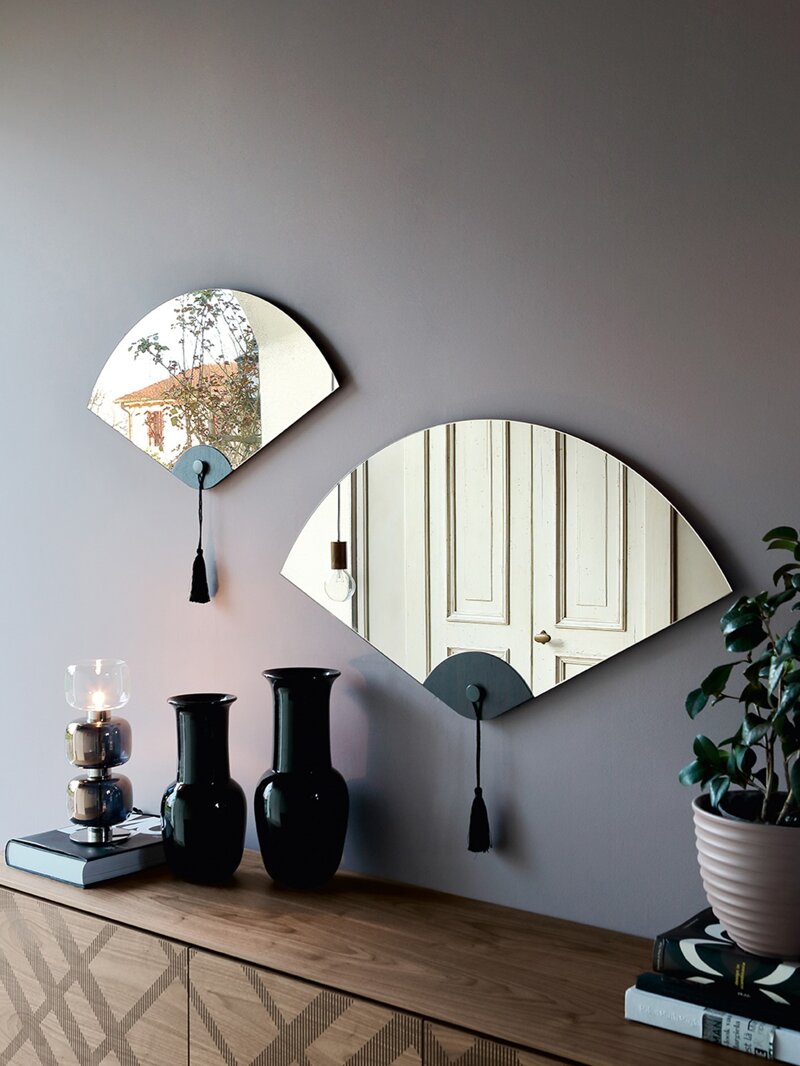 Specchio a ventaglio con struttura in legno o laccato con nappa nera