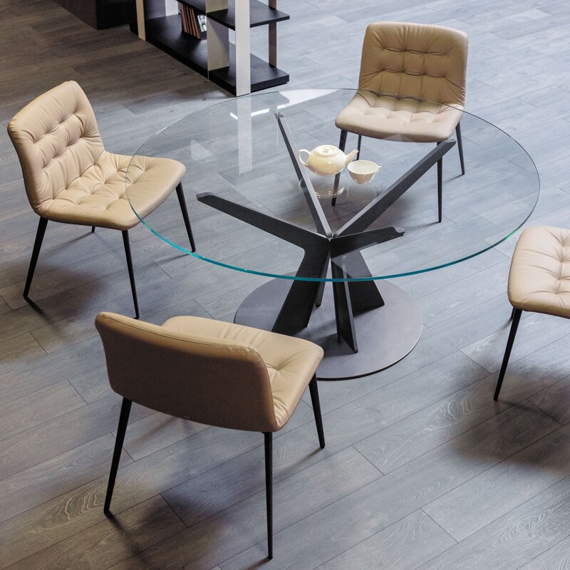 - Struttura metallo grigio carbone con piano tondo diametro 180 cm vetro extra chiaro trasparente