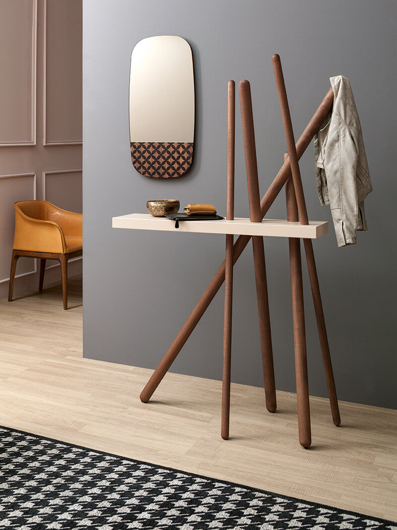 Wood è due oggetti in uno: un appendiabiti e una consolle in un solo elemento; un oggetto che si sviluppa in orizzontale, nel piano in legno tinto, ed anche in verticale, nelle aste appendiabiti in legno. Vario, leggero e resistente come una foresta di bambù: una forma completamente nuova, esteticamente affascinante.